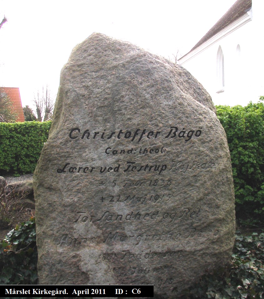 Gravsten ID C6 Person ID: 531 - 532 Arkibas B100031. Se gravstedet Christoffer Bågø Cand Theol Lærer ved Testrup Højskole 5. febr. 1836 22. maj 1915 For sandhed og ret. Anna Margrethe Bågø f. Feddersen 15. juli 1844 6 febr. 1918 Gravstenen og gravstedet er fundet bevaringsværdig og er nu fredet. Se 'Fredede gravminder' øverst i højre hjørne. |
