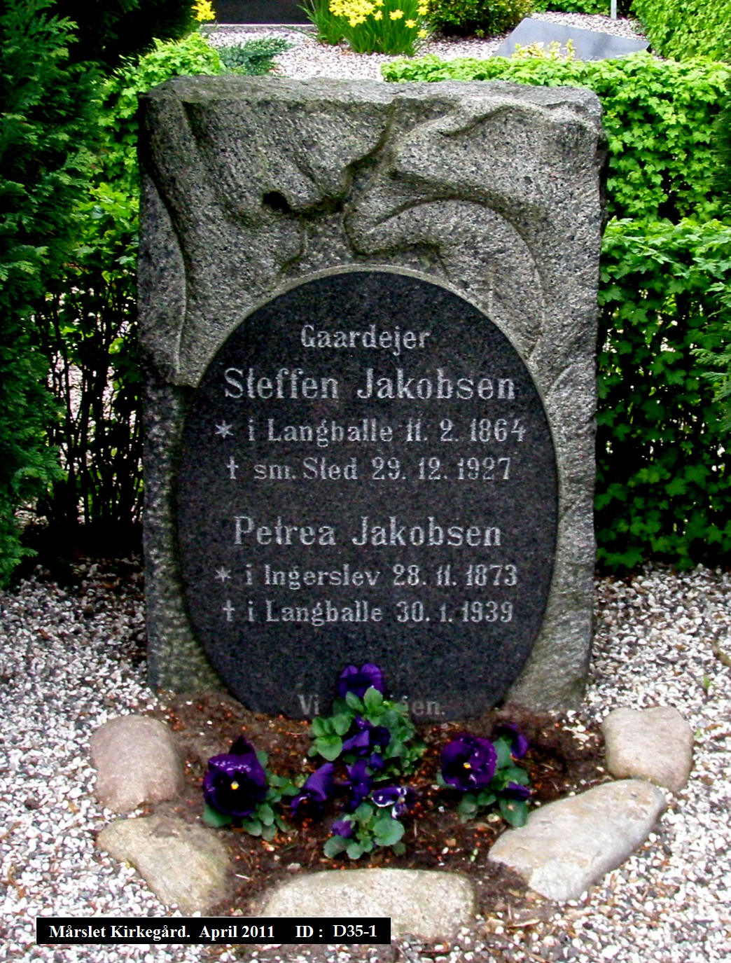 Født: 11-02-1864 Langballe Død: 29-12-1927 Langballe 63 år, 10 måneder, 18 dage Petrea Jakobsen (*Petrea Cicilie Rasmussen Nørmark) Født: 28-11-1873 Ingerslev Død: 30-01-1939 Langballe 65 år, 2 måneder, 2 dage