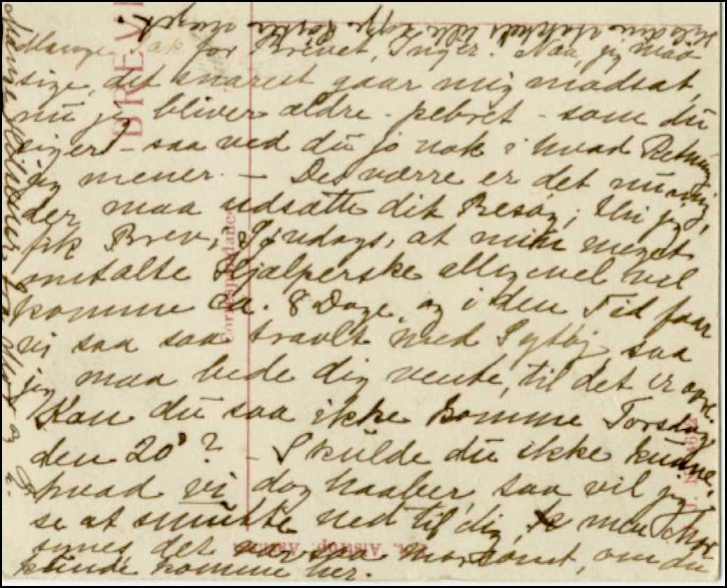 | Mange tak for brevet Inger. Nå, jeg må sige, det snarest går mig modsat, nu jeg bliver ældre - pebret som du siger - så ved du jo nok i hvad retning jeg mener. Desværer er det nu mig, der må udsætte dit besøg; thi jeg fik brev i søndags, at min meget omtalte hjælperske alligevel vil komme ca. 8 dage og i den tid får vi så travlt med sytøj, så jeg må bede dig vente, til det er ovre. Kan du så ikke komme torsdag den 20 ? Skulle du ikke kunne, hvad vi dog håber, så vil jeg se at smutte ned til dig; min mor synes det var så morsomt om du kunne komme her. Mange hilsener fra Mmor og E. Hils din stakkels syge søster meget.