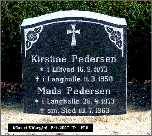 (* Kirstine Marie Svendsen) Født: 16-09-1873 Liltved Død: 11-03-1950 Langballe 76 år, 5 måneder, 23 dage Mads Pedersen Født: 26-04-1873 Langballe Død: 18-07-1963 Langballe 90 år, 2 måneder, 22 dage