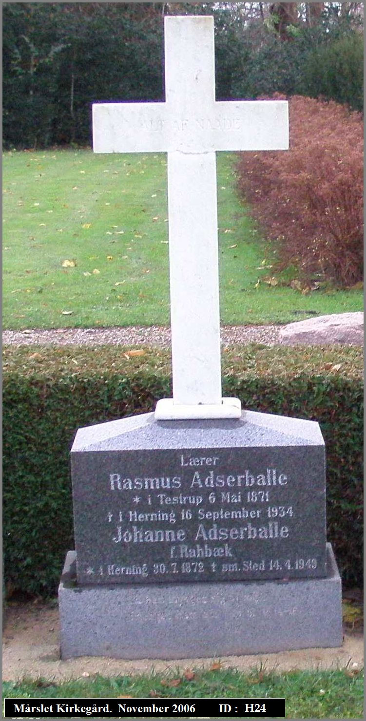 Født: 06-05-1871 Testrup Død: 16-09-1934 Herning 63 år, 4 måneder, 10 dage Johanne Adserballe f. Rahbæk (* Ane Johanne Christine Larsine Lillelund Rahbæk) Født: 30-07-1872 Herning Død: 14-04-1949 Herning 76 år, 8 måneder, 15 dage