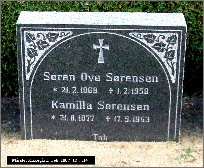 Født: 21-02-1869 Død: 01-02-1958 88 år, 11 måneder, 11 dage Kamilla Sørensen (* Kamilla Sørine Rasmussen) Født: 21-08-1877 Mårslet Død: 17-05-1963 85 år, 8 måneder, 26 dage