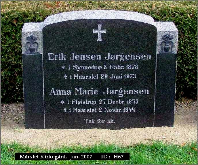 Født: 08-02-1878 Synnedrup Død: 29-06-1973 Mårslet 95 år, 4 måneder, 21 dage Anna Marie Jørgensen (* Ane Marie Nielsen) Født: 27-12-1873 Fløjstrup Død: 02-11-1944 Mårslet 70 år, 10 måneder, 6 dage