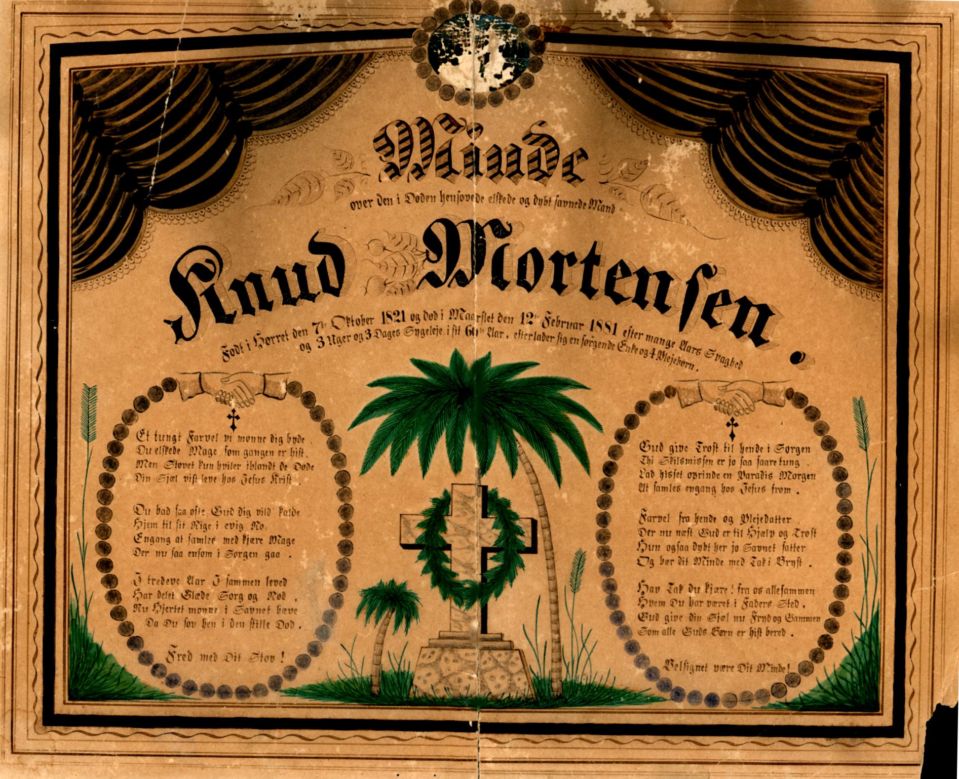 Minde over den i Døden hensovede elskede og dybt savnede Mand Knud Mortensen. Født i Hørret den 7de Oktober 1821 og død i Maarslet den 12 Februar 1881 efter mange Aars Svaghed og 3 Uger og 3 Dages Sygeleje i sit 60 de Aar, efterladende sig en sørgende Enke og 4 Plejebørn. Et tungt Farvel vi monne dig byde - - - - - - - - - - - - - - - - - - - Gud give trøst til hende i Sorgen Du elskede Mage som gangen er hist - - - - - - - - - - - - - - - - - Thi Skilsmissen er jo saa saare tung Men Støvet kun hviler iblandt de Døde - - - - - - - - - - - - - - - - Lad hisset oprinde en Paradis Morgen Din Sjæl vist leve hos Jesus Krist . - - - - - - - - - - - - - - - - - - - At samles engang hos Jesus from . Du bad saa ofte Gud dig vild kalde - - - - - - - - - - - - - - - - - - - Farvel fra hende og Plejedatter Hjem til sit Rige i evig Ro - - - - - - - - - - - - - - - - - - - - - - - - - - Der nu næst Gud er til Hjælp og Trøst Engang at samles med kjære Mage - - - - - - - - - - - - - - - - - - - Hun ogsaa dybt her jo Savnet fatter Der nu saa ensom i Sorgen gaa . - - - - - - - - - - - - - - - - - - - - - Og bær dit Minde med Tak i Bryst . I fredens Aar I sammen leved - - - - - - - - - - - - - - - - - - - - - - - - Hav Tak du kjære ! fra os allesammen Har delet Glæde og Sorg og Nød , - - - - - - - - - - - - - - - - - - - - Hvem Du har været i Faders Sted , Nu Hjertet monne i Savnet bæve - - - - - - - - - - - - - - - - - - - - - Gud give din Sjæl nu Fryd og Gammen Og Du sov hen i den stille Død . - - - - - - - - - - - - - - - - - - - - - - Som alle Guds Børn er hist bered . Fred med Dit Støv ! - - - - - - - - - - - - - - - - - - - - - - - - - - - - - - - - Velsignet være Dit Minde !