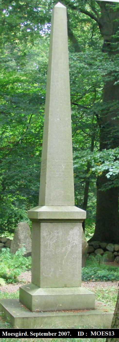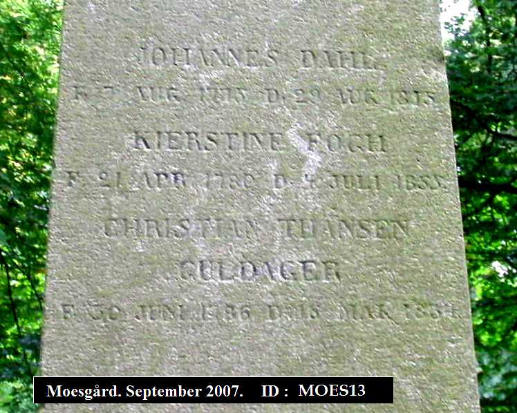 Obelisken med indskriften står på gravpladsen i Moesgård park. Forældre til Thorkild Christian Dahl. Guldager er Kirstien Foghs 2 mand. Personerne har ingen tilknytning til Mårslet sogn. |
