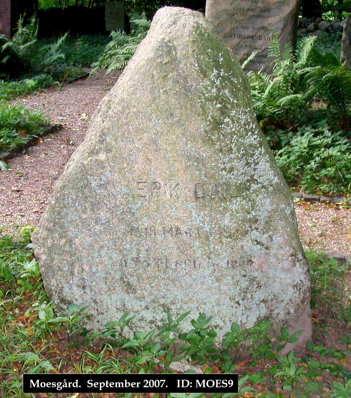 Gravstenen står på gravpladsen i Moesgaård park.