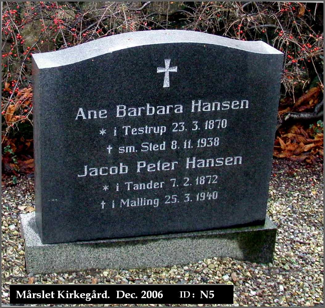 (* Rasmussen) Født: 23-03-1870 Testrup Død: 08-11-1938 Testrup 68 år, 7 måneder, 16 dage Jacob Peter Hansen Født: 07-02-1872 Tander Død: 25-03-1940 Malling 68 år, 1 måned, 18 dage