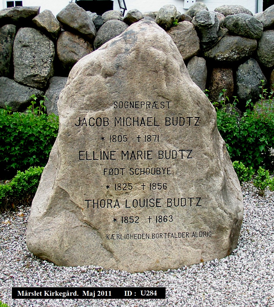 Gravsten ID U284 Person ID: 214 - 215 - 216 Arkibas B100313. Se gravstedet SOGNEPRÆST JACOB MICHAEL BUDTZ * 1805 + 1871 ELLINE MARIE BUDTZ FØDT SCHOUBYE * 1825 + 1856 THORA LOUISE BUDTZ * 1852 + 1863 KÆRLIGHEDEN BORTFALDER ALDRIG 'BUTZ's historie Gravstenen er fundet bevaringsværdig og er nu fredet. Se 'Fredede gravminder' øverst i højre hjørne. |
