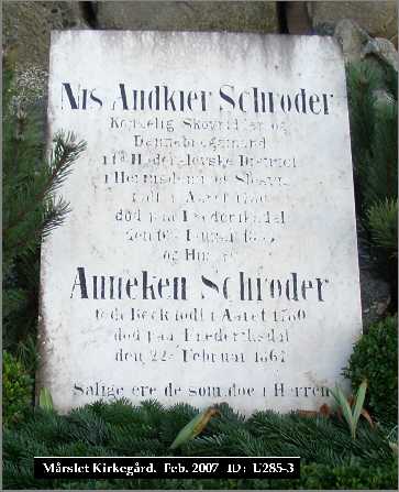 Se familien Schrøders gravsted Nis Andkier Schrøder Kongelig Skovridder og Dannebrogsmand i 1d Haderlevske District i Hertugdømmet Slesvig født i Aaret 1780 død paa Frederiksdal den 16de Januar 1853 og Hustru Anneken Schrøder født Beck født i Aaret 1780 død paa Frederiksdal død d 22d Februar 1867 Salige ere de som.døe i Herren. |