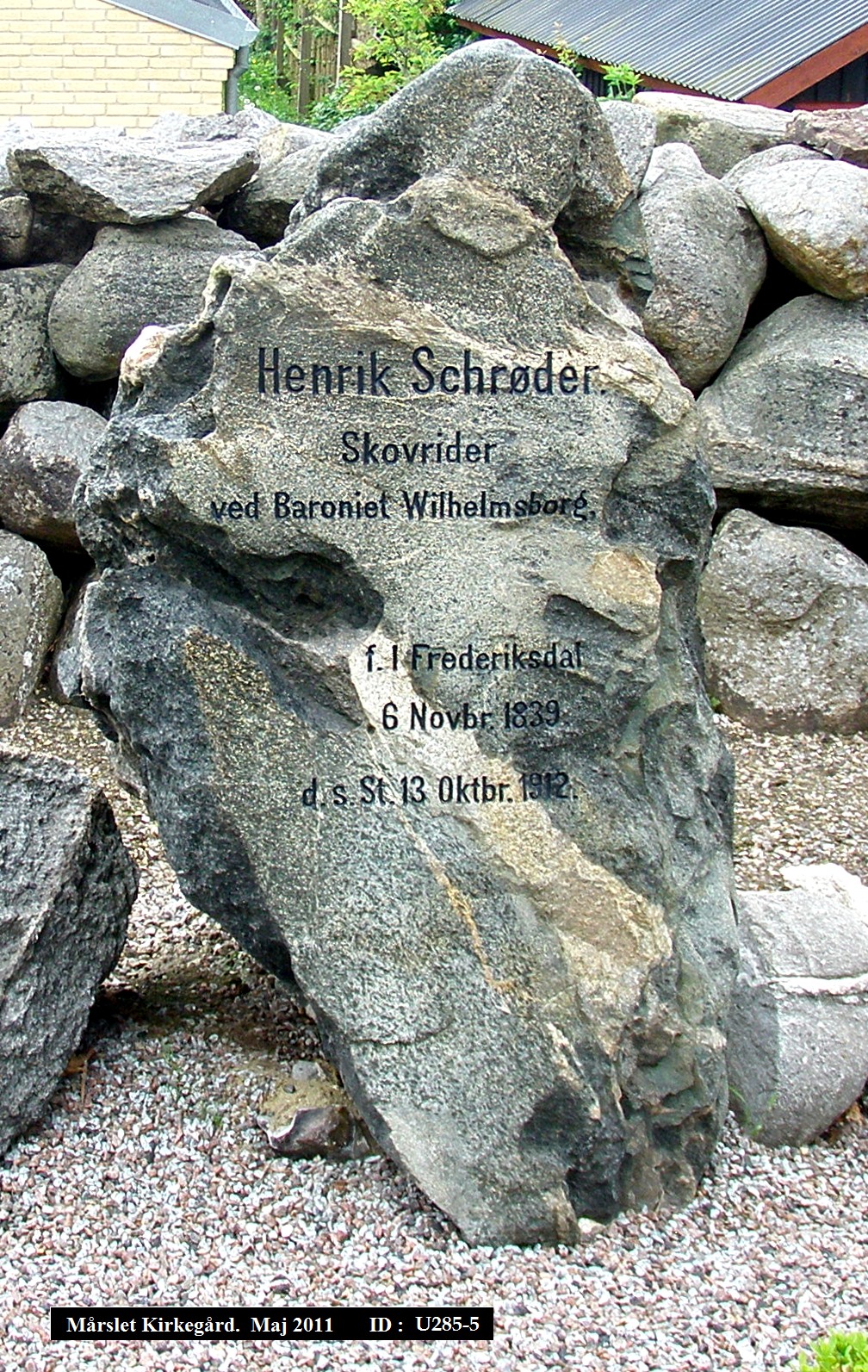 Se familien Schrøders gravsted Henrik Schrøder Skovridder ved Baroniet Wilhelmsborg f I Frederiksdal 6 Novbr. 1839. d.s.St. 13 Oktbr. 1912 Gravstenen er fundet bevaringsværdig og er nu fredet. Se 'Fredede gravminder' øverst i højre hjørne.