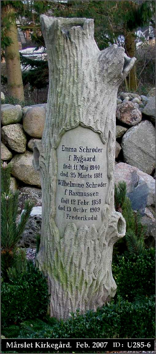 | Hans første kone vae Emma Alvilda Rygaard (1840-81) med hvem han havde 4 børn. I 1882 giftede han sig med Wilhelmine Cecilie Rasmussen (1858-1909), der var datter af forvalteren på Moesgård. Gravstelen formet som en træstamme med afhuggede grene skal symbolisere det afbrudte liv. På grave fra omkring århundredskiftet sås ofte sådanne gravsteler, men i dag er stelen på Schrødergravstedet den eneste bevarede på Mårslet kirkegård. Tekst: Hans Møller. |
