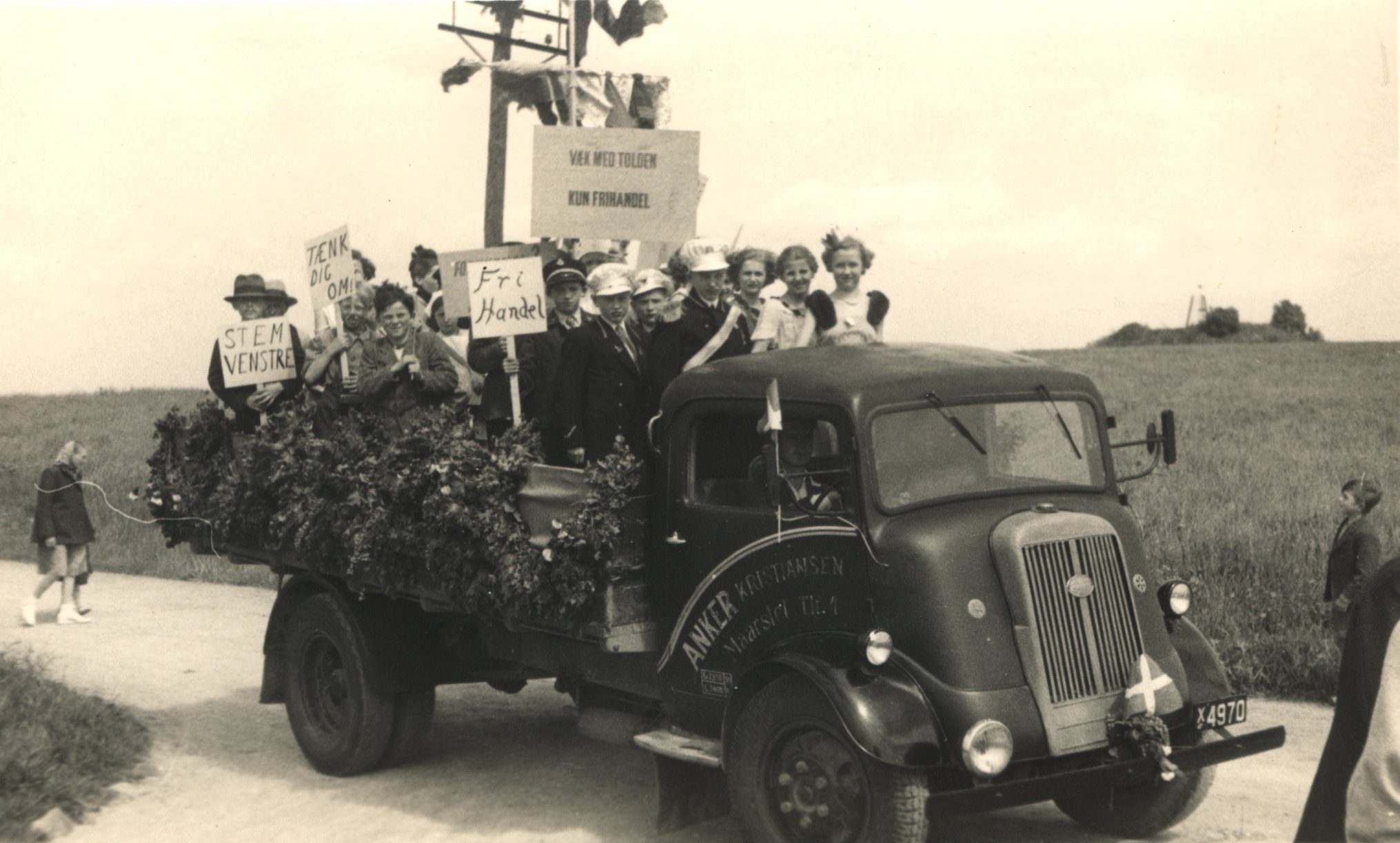 På lastbilen med nummeret X 4970 står: 'ANKER KRISTIANSEN Maarslet Tlf. 4' Chaufføren er sønnen Erik Kristiansen (uden kørekort ifølge Erik selv!). Fra højre ses: Birgit Frandsen Hørretløkken, Ebba Poulsen Visbjerg. Kirsten Holm. Gl. Bedervej. Gartneriet Birkedal. Drengen nr. 3 fra venstre med sort strithår. Arne Knudsen. Den første dreng efter skiltet "fri handel" Jørgen Andersen Ovesdal. Genkendt af Grethe Sørensen Visbjerg Hegn. April 2010. Billedet er taget i Overmaarslet, hvor Mustrupvej drejer fra Tandervej og hvor "grundlovsoptoget" vendte. I baggrunden ses vandværkets beholder i "højen" på Ovesdals jorde. (Peder Kristiansen apr. 2010)