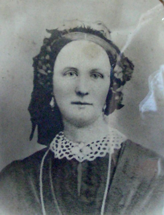 | 'Kirsten Jensen. Født Nielsen Fogh. Fød i en Gaard i Langballe som senere blev købt til Vilhelmsborg. Gift med Hans Jensen fra Skovfogedboligen i Marselisborg Skov. Kirsten døde 7 Aar efter giftemålet med Hans Jensen. Det var en meget varm sommer da Kirsten døde Hans Jensen maatte sætte hendes kiste ind ved eller bag Møllehjulet, det kunde Hans Jensen aldrig glemme derfor afstod han møllen og købte Mårslet Vindmølle med Bageri. Blev senere gift med en Pige fra Thy med hende fik han en datter og 4 sønner. H. J. købte senere Mårslet Præstegårds jord og Jordmoder lodden til så Møllegården blev på godt 40 td. land. Dette billede forestiller hans første kone Kirsten født Nielsen Fogh. Aflev. af Søren Vestergård Pederstrup Enggård Løjenkærvej 34. 8300 Odder.' | |||