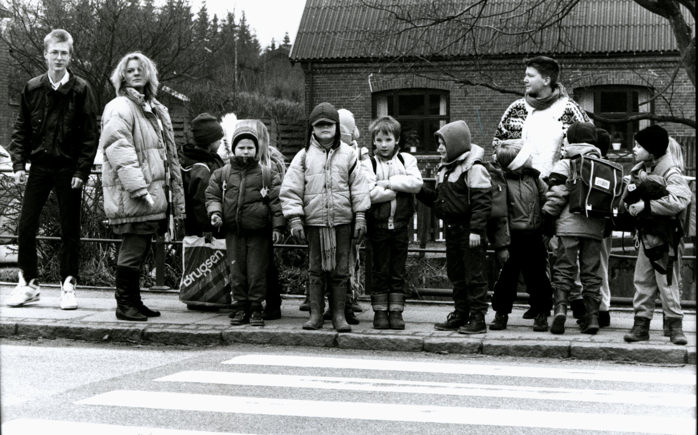 10. klasserne på Mårslet Skole var i januar måned 1989 trafikvagter for børnehaveklasserne og de yngste årgange, når de skulle over fodgængerovergangen i midtbyen ved provisbanken.