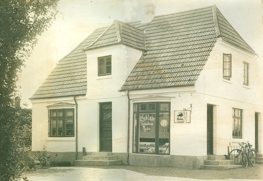 | Det afvalmede tag af cementtagsten er nu erstattet af eternittag og taget har fået udhæng. Dør og vindue i gavl længst mod gaden er muret til. Med disse undtagelser har huset bevaret sin stil. Bemærk skiltet i vinduet: "Cykler - Symaskiner - Radio" og "AP's" monogram. Ud fra muren hænger et reklameskilt for "Royal Einfield". Dette skilt dækker delvis for et reklameskilt på muren for "Mobil Oil" | ||