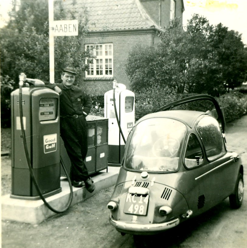 Kabinescooternes tid i 1950'erne. Aage Larsen ved benzintanken.