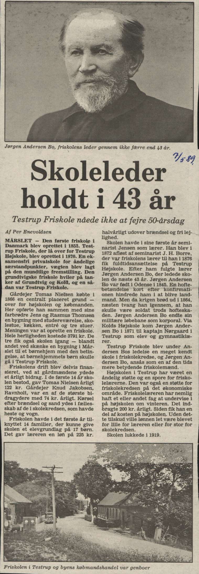 Skoleleder holdt i 43 år. Avisartikel 7. maj 1989. Af Per Enevoldsen.