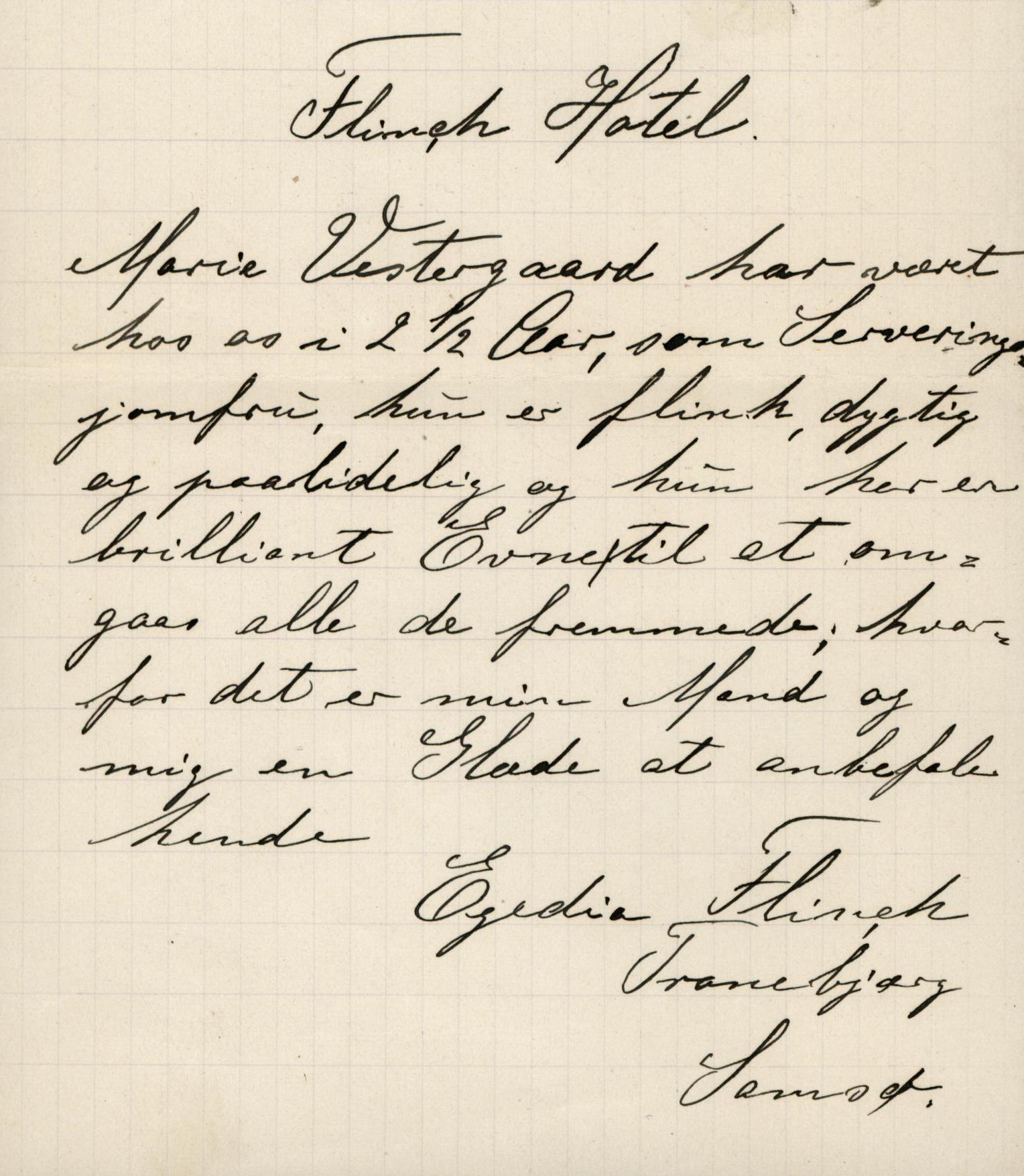 Marie Vestergaard har været hos os i 2½ Aar, som Serveringsjomfru, hun er flink, dygtig og paalidelig og hun har en brilliant Evne til at omgaa alle de fremmede, hvorfor det er min Mand og mig en Glæde at anbefale hende.