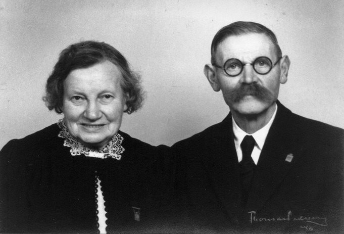 | Karls bemærkninger: Anine og Magnus Andersen. Foto taget omkring 1948. Bemærk deres badges. De bar Kong Christians den X's emblem i anledning af kongens 70 års fødselsdag. Meget populær på det tidspunkt. Alle bar dem. Nål for damerne og revers for mænd. De var en dansk sølv flag med rød farve og et 'C' i midten. Alle havde en. Folk var stadig iført dem 10 år senere. Måske er de stadig bærer dem nu??? Folk elskede kongen. Karl