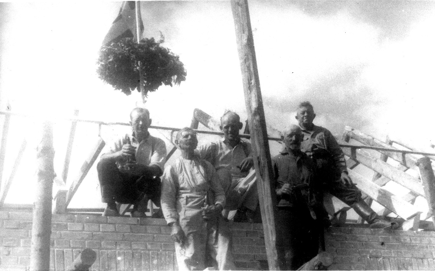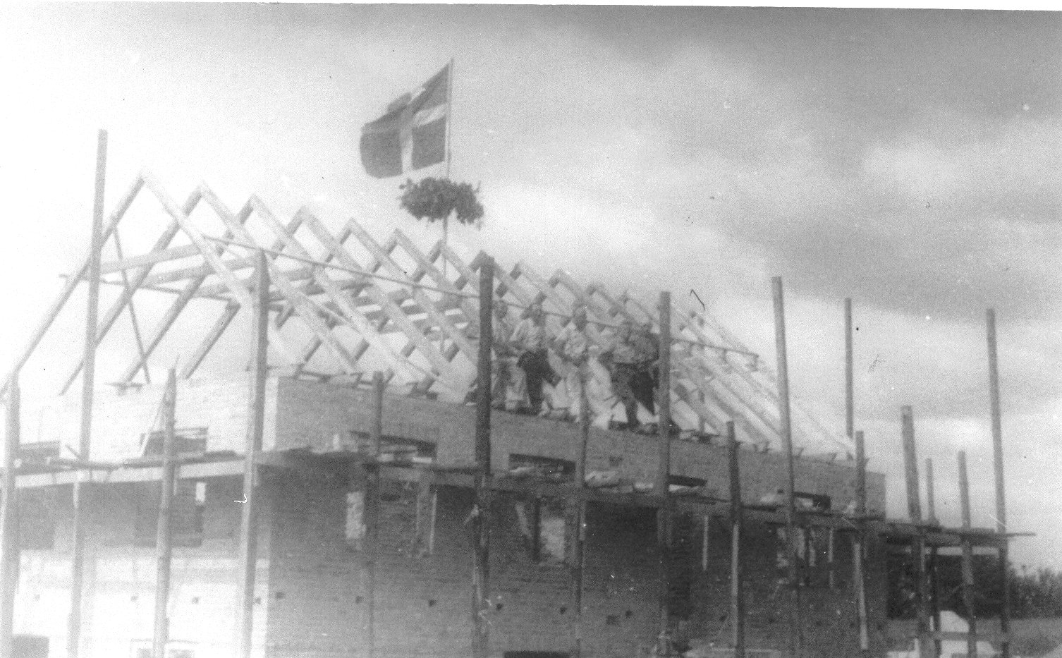 | Huset blev bygget i 1948 af min far, Paulli Rasmussen fra Beder. Som det ses på billederne, havde han hjælp fra alle: 1. Lindgaard fra Vilhelmsborg, smed. Jeg kender ikke hans fornavn - vi kaldte ham altid Lindgaard. 2. Søren Frederiksen fra Langballe Bakken, vognmand og blikkenslager. 3. Magnus Andersen fra Langballe Bakken. 4. Niels Rasmussen fra Beder, snedker. Hans far var min farfar. 5. Kaptajn Carl P. Mogensen. Langballe Bakken - Villa Nete. Gift med Agnete Andersen - datter af Magnus Andersen. 6. Paulli Rasmussen fra Beder, murersvend. (dengang boede på Vilhelmsborg) Paulli og Lindgaard var naboer. 7. Hans bror, Ali Rasmussen, arkitekt), ikke med på billede, havde designet huset. Det lignede et 1-etagers hus, men der var faktisk 3 etager. Der var kælder kun med lange smalle vinduer lige over jordoverfladen. Stue etagen havde en vindfang, en entre, to soveværelser, et badeværelse, et køkken, en spisestue og en loungeroom. Den øverste etage havde kun et stort rum. Huset opvarmes med centralvarme. Kedlen var i kælderen. Ca. 30 år senere blev huset revet ned da Odder Landevej blev udvidet. Huset lå 50 meter syd for 8 km stenen på den vestlige side af vejen. Omkring 200 m nord for Moesgård Allé udmunding i Odder landevej. Endelig. På internettet fandt jeg et luftfoto af hele Danmark i 1954. (Spion fotos) Jeg fandt vores hus og kunne se frugttræerne som min far havde plantet, præcis som jeg husker dem i 1954 da jeg var 9 år gammel.