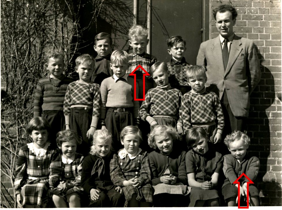 | Bagerst fra venstre: - Jens Lindgaard, Vilhelmsborg (Bror til Jørgen Lindgaard) - Karl Johan Rasmussen, Langballe Bakke (Bror til Elisabeth Rasmussen) - Arne Thomsen, Teglværkshus - Olaf Stær, Langballe, Lærer I midten fra venstre: - Leo Løwquist, Sofienbjerg - Jens Bay, Langballe - Jørgen Torp, Langballe Bakke - Leo Jensen, Vilhelmsborg - Jørgen Lindgaard, Vilhelmsborg (Bror til Jens Lindgaard) Forrest fra venstre: - Birgit Hoffmann, Egelund (Søster til Lis Hoffmann) - Lis Hoffmann, Egelund (Søster til Birgit Hoffmann) - Margit Riis, matr. 16 - Else Marie Mogensen, Lille Langballe Bakke - Anne Lise Ebbesen, Trekanten - Martha Træholt, Moesgård - Elisabeth Rasmussen, Langballe Bakke (Søster til Karl Johan Rasmussen