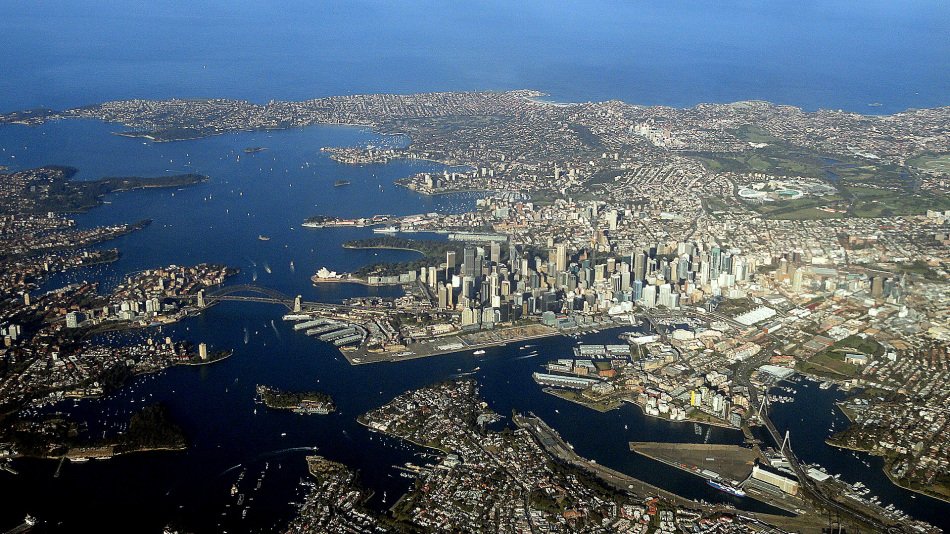 | Karls bemærkninger: Jeg tænkte at dette billede ville være interessant. Jeg bruger det som en desktop billede på min computer. Det er Sydney, set fra luften. Det er mod øst, og man kan se havet (Tasmanske Hav). Indløbet til havnen er ikke med på billedet. Det er lige over hvor jorden tynder ud. I midten ses byen. Mod venstre (mod nord) du se Sydney Harbour Bridge som min bedstefar (Karl Andersen) arbejdede på det mellem 1930 og 1932 som en stål arbejdstager. Spændvidden er omkring 1/2 km. Lige øst for broen, kan ses Sydney Opera House, tegnet af den danske arkitekt Jørgen Utzen (ren hvid bygning). Det smalle vand mellem broen og operahuset hedder Sydney Cove. Der boede omkring et par hundrede mennesker i 1788 hvor de høje bygninger nu er. De var de første hvide mennesker i dette enorme land. 50 år efter var Sydney på størrelse med Mårslet, så fandt de guld vest for Sydney og byen boomede. Nu er det omkring 5 Mio. De olympiske lege 2000 blev afholdt omkring halvvejs mellem min bopæl og byen. Jeg bor omkring 20 km mod vest. Min søster Elisabeth bor halvvejs mellem byen og havet. Min ældste søn bor i Woollongong omkring 100 km sydpå. Min yngste søn bor i en høj bygning nær den anden bro - i nederste højre hjørne af billedet.
