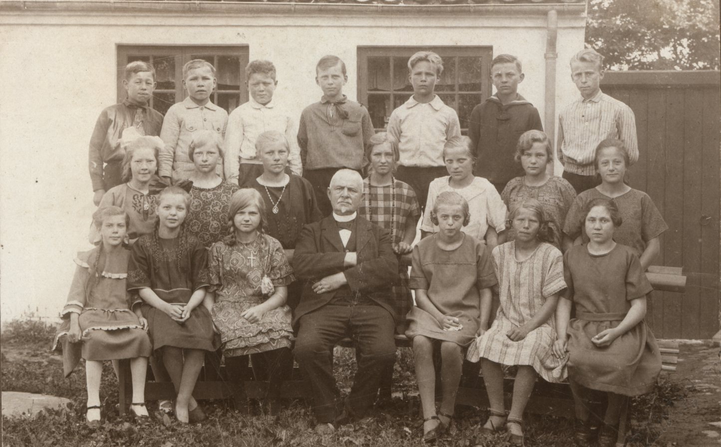 Billedet af efterårs konfirmationsholdet der blev konfirmeret 1925 Forrest i midten, pastor Johan Mikkelsen, der var sognepræst ved Mårslet Kirke 1925 Forår eller efterår? Billedet lånt af Grethe Sørensen. Visbjerg Hegn. April 20013. Registreret i Arkibas. Billed ID: B10439