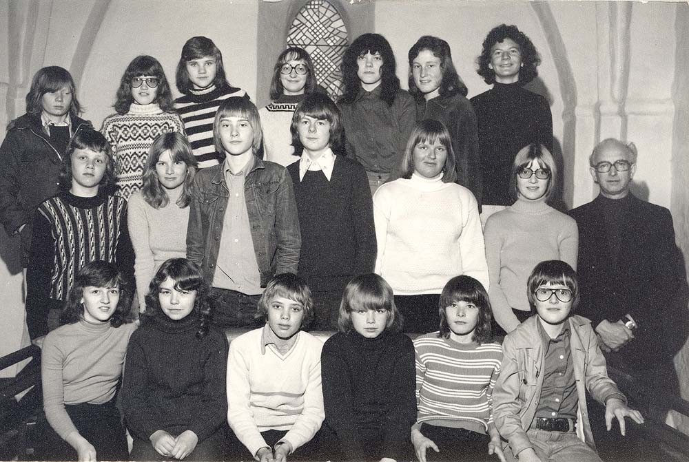 7.a klasse 1974/75 blev konfirmeret søndag den 20. april 1975 af sognepræst Jens Yde. Vil du se billedet større - tryk på billedet. Genkendt og navngivet af Marianne Rimmen Møller 10/5 2009. Registreret i Arkibas. Billed ID: B843.