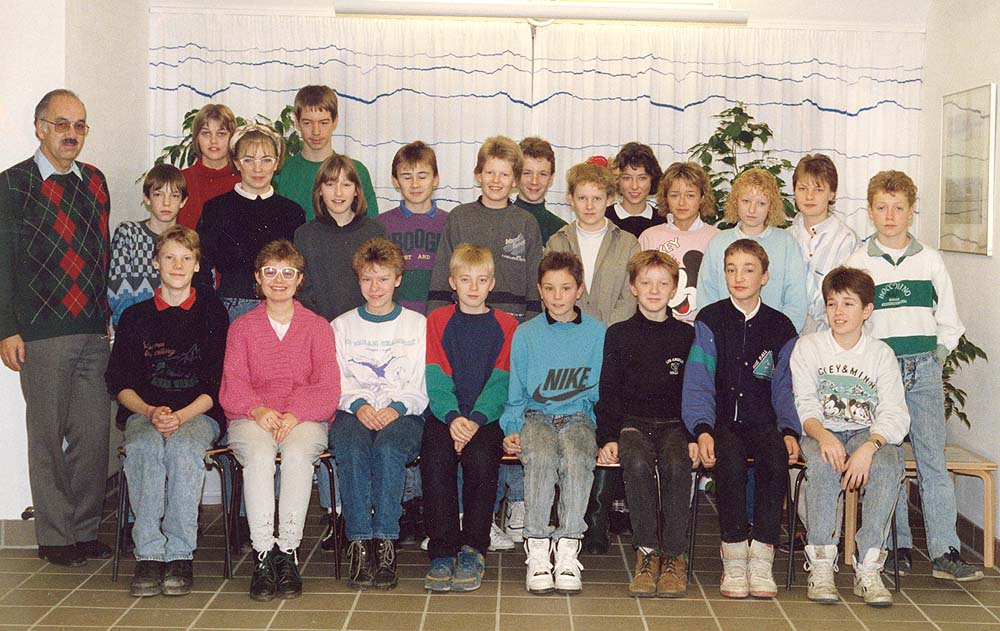 7.a 1988/89 blev konfirmeret af sognepræst Martin Kontni. Billedet er taget i det nye sognehus' forhal ved konfirmationsforberedelsens start i efteråret 1988 af Annelise Kontni. Vil du se billedet større - tryk på billedet. Genkendt og navngivet af Anne Grethe Ring Præstegaard 2012. Registreret i Arkibas. Billed ID: B2703