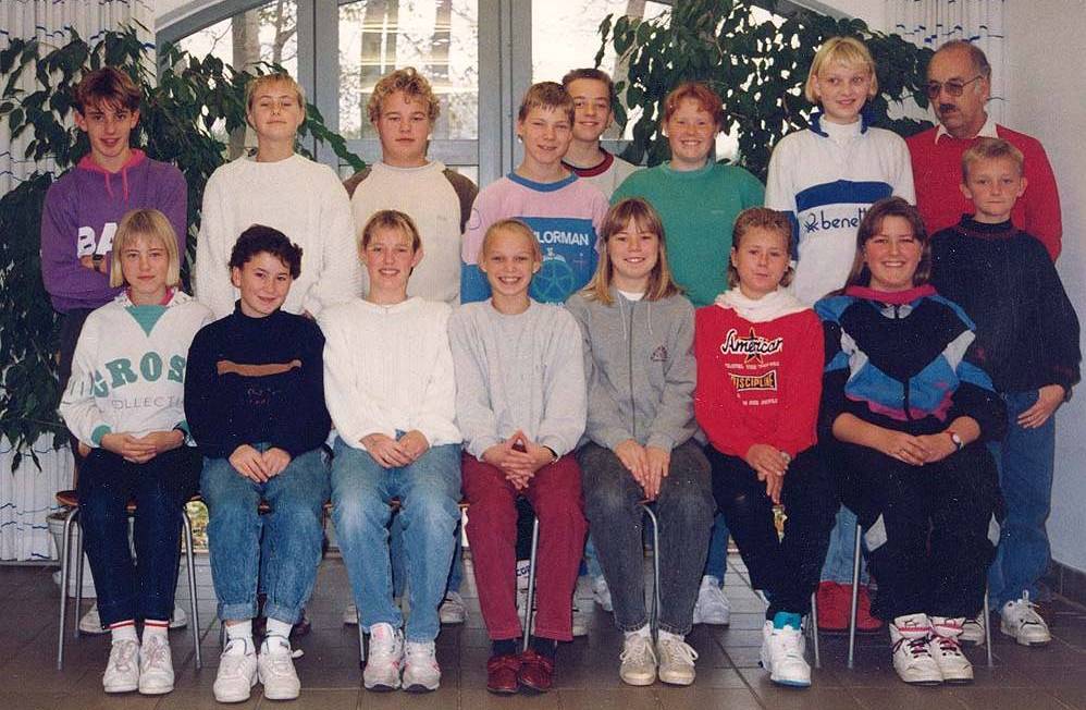 7.a 1991/92 blev konfirmeret af sognepræst Martin Kontni. Billedet er taget i forhallen til det nye sognehus i efteråret 1991 ved starten på konfirmationsforberedelserne. (Foto: Annelise Kontni) Vil du se billedet større - tryk på billedet. Placering og navngivet af Tina Brandt Andersen. April 2013. Registreret i Arkibas. Billede ID: B2709