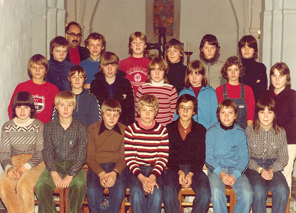 7.b 1979/80 blev konfirmeret af sognepræst Martin Kontni. Billedet er taget i Mårslet Kirke ved starten af konfirmationsforberedelsen i efteråret 1979 af Annelise Kontni.