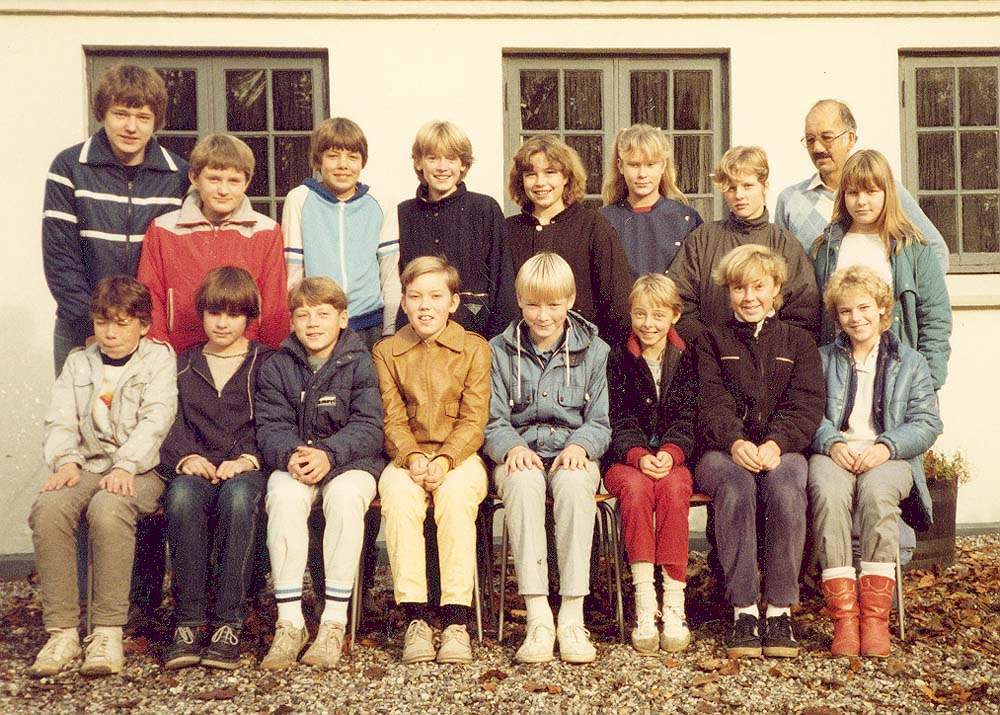 7.b 1984/85 ved starten på konfirmationsforberedelsen hos sognepræst Martin Kontni. Billedet er taget i præstegården efteråret 1984 foran det gamle - og nu nedrevne - sognehus. (Foto: Annelise Kontni)
