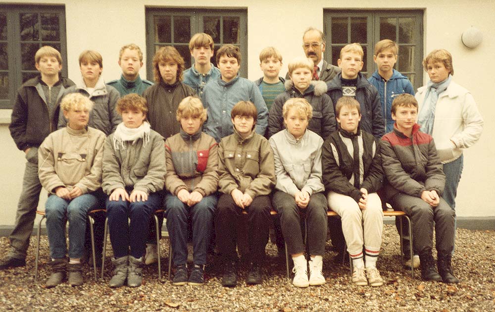 7.c 198c/85 ved starten på konfirmationsforberedelsen hos sognepræst Martin Kontni. Billedet er taget i præstegården efteråret 1984 foran det gamle - og nu nedrevne - sognehus. (Foto: Martin Kontni) Vil du se billedet større - tryk på billedet. Genkendt og placeret af familien Thers Jørgensen oktober 2013. Registreret i Arkibas. Billed ID: B2892