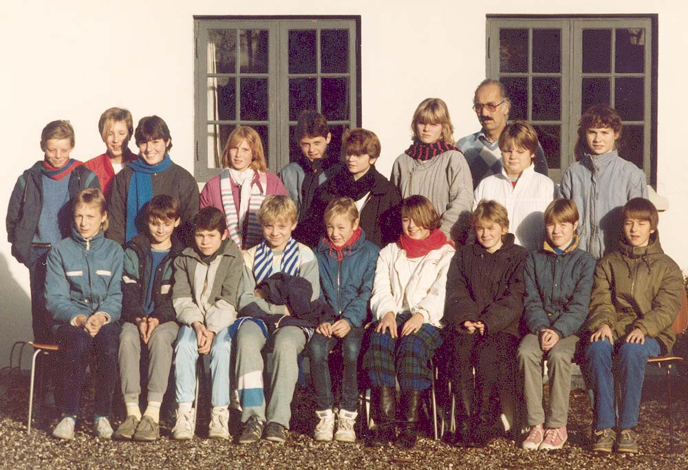 7.c 1985/86 ved konfirmationsforberedelsens start. Billedet er taget i præstegården foran det gamle - og nu nedrevne - sognehus i efteråret 1985. (Foto Annelise Kontni)