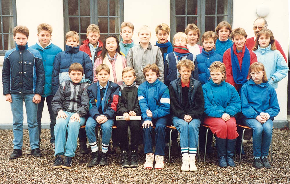 7.c 1986/87 fotograferet ved starten af konfirmandundervisningen. Billedet er taget i efteråret 1986 foran det gamle - nu nedrevne -sognehus. (Foto: Annelise Kontni)
