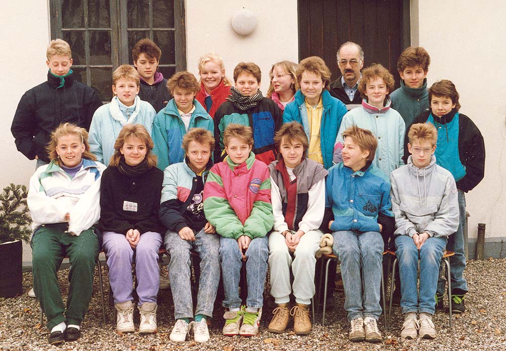 7.c 1987/88 blev konfirmeret af sognepræst Martin Kontni. Billedet er taget ved konfirmationsforberedelsens start foran det tidligere - og nu nedrevne sognehus - i efteråret 1987 af Annelise Kontni.