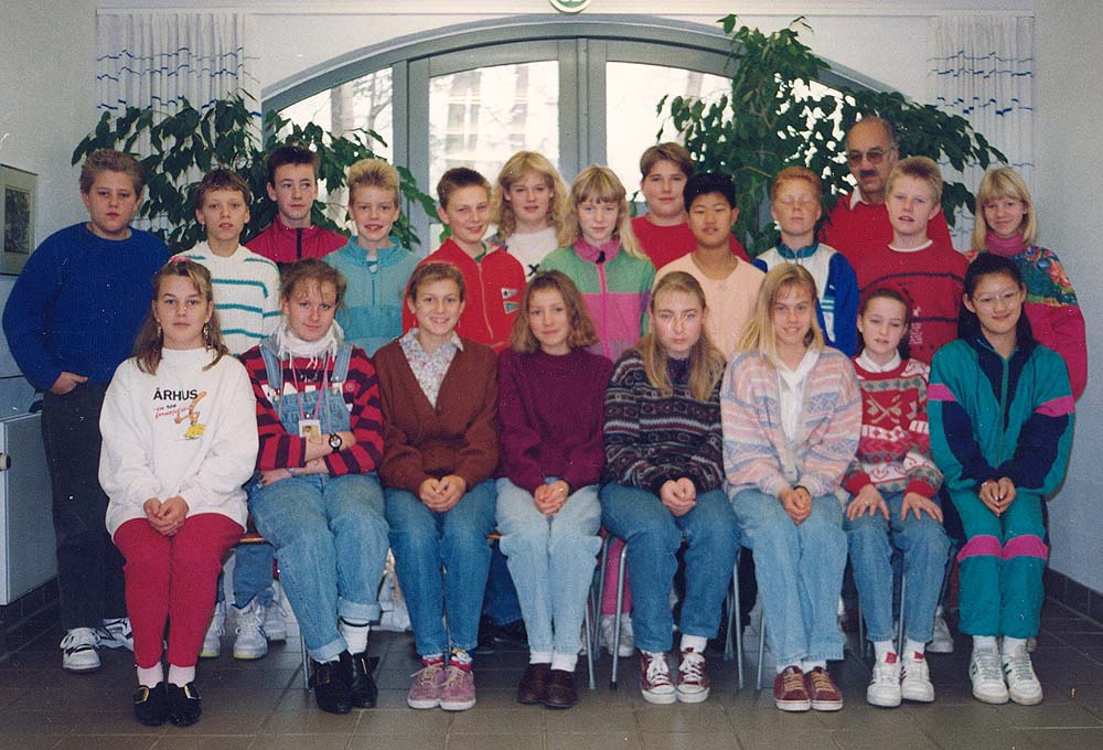 7.c 1991/92 blev konfirmeret af sognepræst Martin Kontni. Billedet er taget i forhallen til det nye sognehus i efteråret 1991 ved starten på konfirmationsforberedelserne. (Foto: Annelise Kontni)