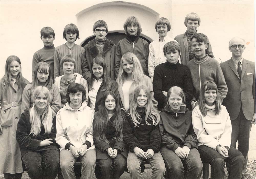 7. klasse 1971 blev konfirmeret af sognepræst Jens Yde. Billedet er taget ved indgangen til våbenhuset og Mårslet Kirke.