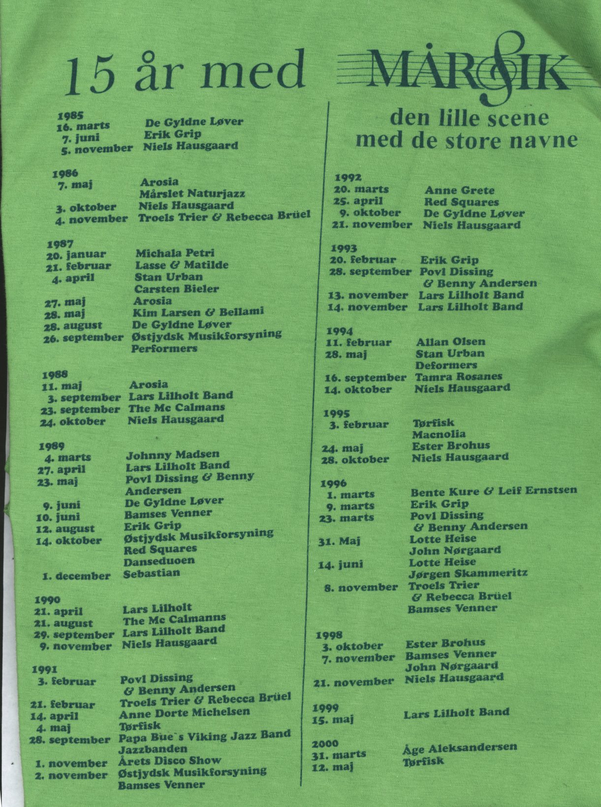 | Finn Bøje døde december 2010. Følgende mmindeord kan ses i Mårsletbladet februar 2010: Finn Bøje var kendt for at arrangere koncerter og begyndte allerede på dette i Frederikshavn og fortsatte i Mårslet med koncertvirksomheden. I 1985 startede han Mårsik, som arrangerede en lang række koncerter og arrangementer, hvis formål var at skaffe penge til foreningslivet i Mårslet. Ved Mårsiks 15-års jubilæum i 2000 var det blevet til 64 arrangementer, og der var på daværende tidspunkt doneret ca. kr. 600.000 til foreningslivet i Mårslet. Efterfølgende blev der frem til april 2004 afholdt yderligere 11 koncerter, så alt i alt har Finn arrangeret 75 koncerter i Mårslet og bidraget rigtig meget økonomisk og kulturelt til Mårslets foreningsliv. Finns store bidrag, især til TMG, resulterede da også i at han blev æresmedlem af TMG, og i 1985 blev udnævnt til årets Mårsletborger. Finns store berøringsflade til mange kunstnere gjorde, at han fik rigtigt mange gode kendte kunstnere til Mårslet. Endvidere havde Finn også en særlig evne til at få mange af sine bekendte til at hjælpe med alle arrangementerne. I anledning af 15-års jubilæet i 2000 blev der fremstillet en T-shirts med påtrykt arrangementerne gennem de 15 år. Et eksemplar af T-shirtsen er givet til Egnsarkivet. En del plakater fra arrangementerne, der nu er registreret og ligger nu på Egnsarkivet, kan ses her på hjemmesiderne. Registreret i Arkibas. Billed ID: B9200 (maarsik_b9200.jpg) | |