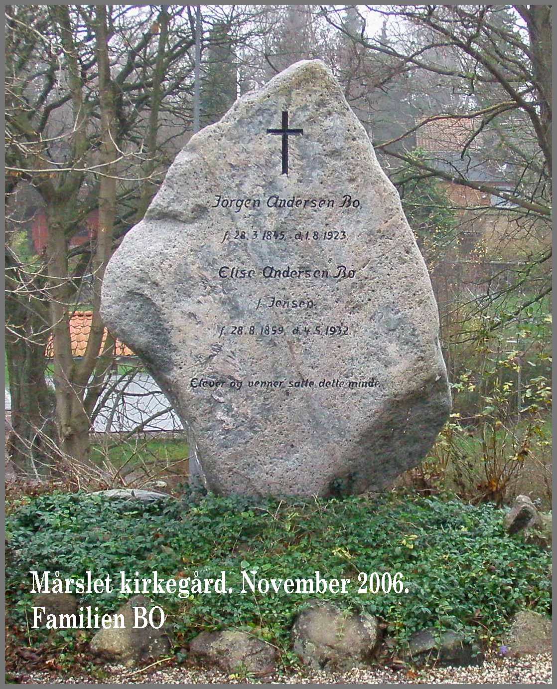 Jørgen Andersen Bo f. 28.3.1845 d. 1.8.1923 Elise Andersen Bo f. Jensen f. 28.8.1859 d. 4.5.1937 Elever og venner satte dette minde