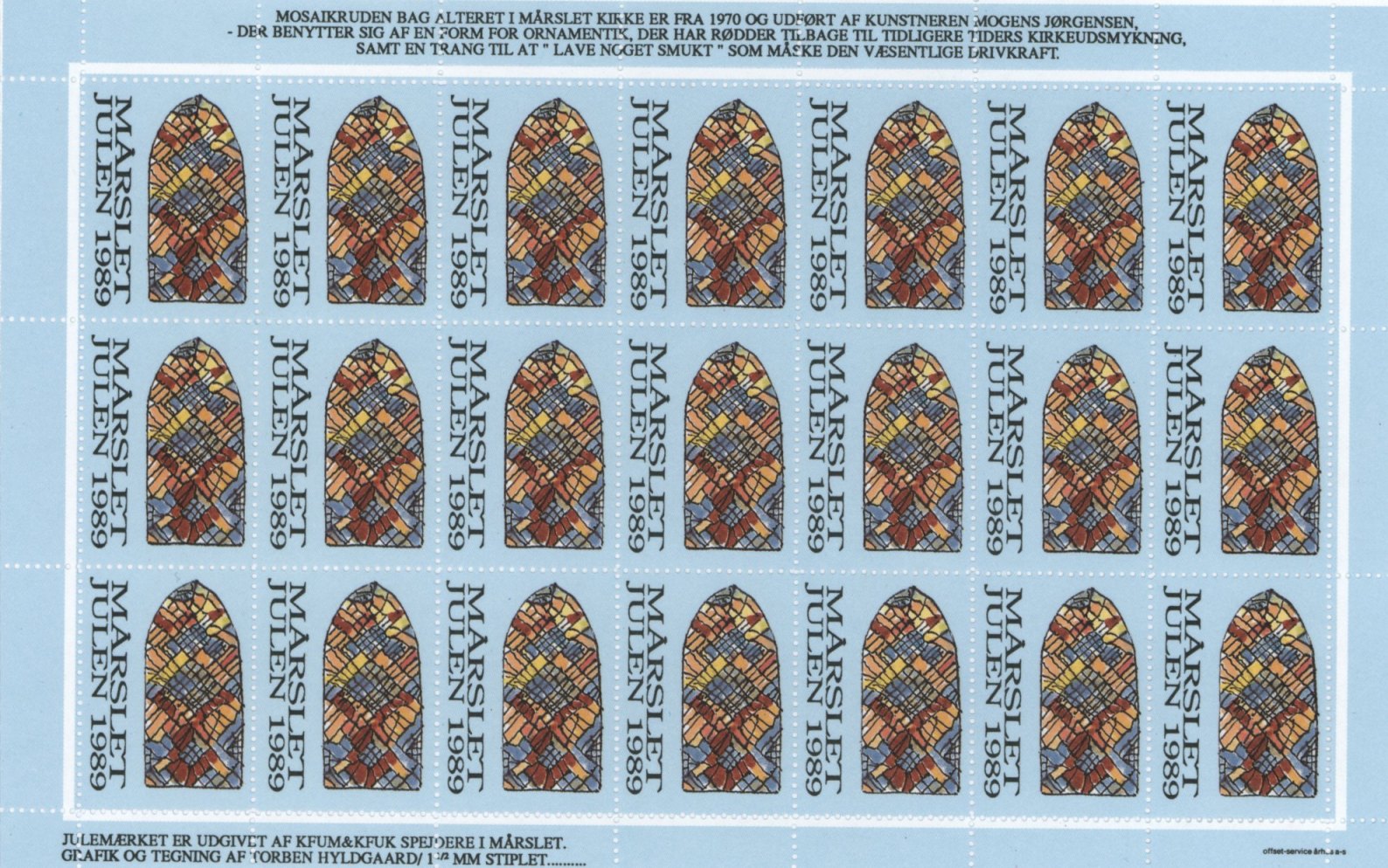 1989. Grafik: Torben Hyldgaard. - Motiv: Mosaikrude bag alteret i Mårslet Kirke.
