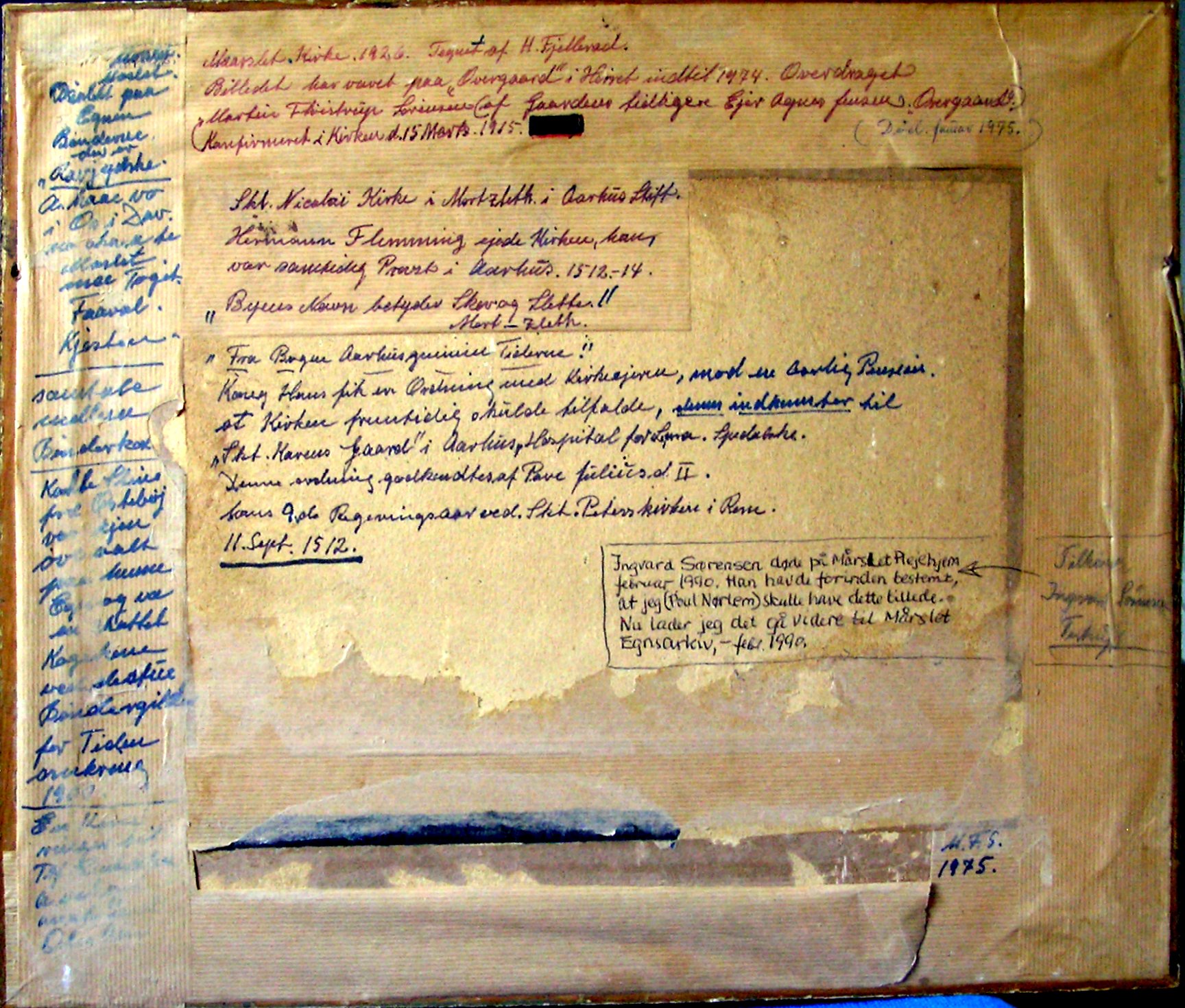 | 'Maarslet Kirke. 1926. Tegnet af H. Fjellerad. Billedet har været paa 'Overgaard' Hørret indtil 1974. Overdraget Martin Fløistrup Sørensen? (Konfirmeret i Kirken d. 15 Marts 1915) af gaardens tidligere Ejer Agnes Jensen. Overgaard. (Død januar 1975). Skt. Nicolai Kirke i Mortzleth i Aarhus Stift. Hermann Flemming ejede Kirken, han var samtidig præst i Aarhus. 1512-14. Byens navn betyder Skov og Slette. Mort - zleth. Fra Bogen Aarhus gennem Tiderne. Kong Hans fik en Ordning med Kirkeejeren, mod en Aarlig Pension. at Kirken fremtidig skulde tilfalde, _? indkomster til 'Skt. Karens Gaard' i Aarhus, Hospital for Syge? Spedalske. Denne ordning godkendtes af Pave Julius II. hans 9de regeringsaar ved Skt Peterskirken i Rom. 11. Sept. 1512. Tilhører Ingvard Sørensen. Testrup.' Indskudt tekst skrevet af Poul Nørlem: 'Ingvard Sørensen døde på Mårslet Plejehjem februar 1990. Han havde forinden bestemt, at jeg (Poul Nørlem) skulle have dette billede. Nu lader jeg det gå videre til Mårslet Egnsarkiv - feb. 1990.' | |