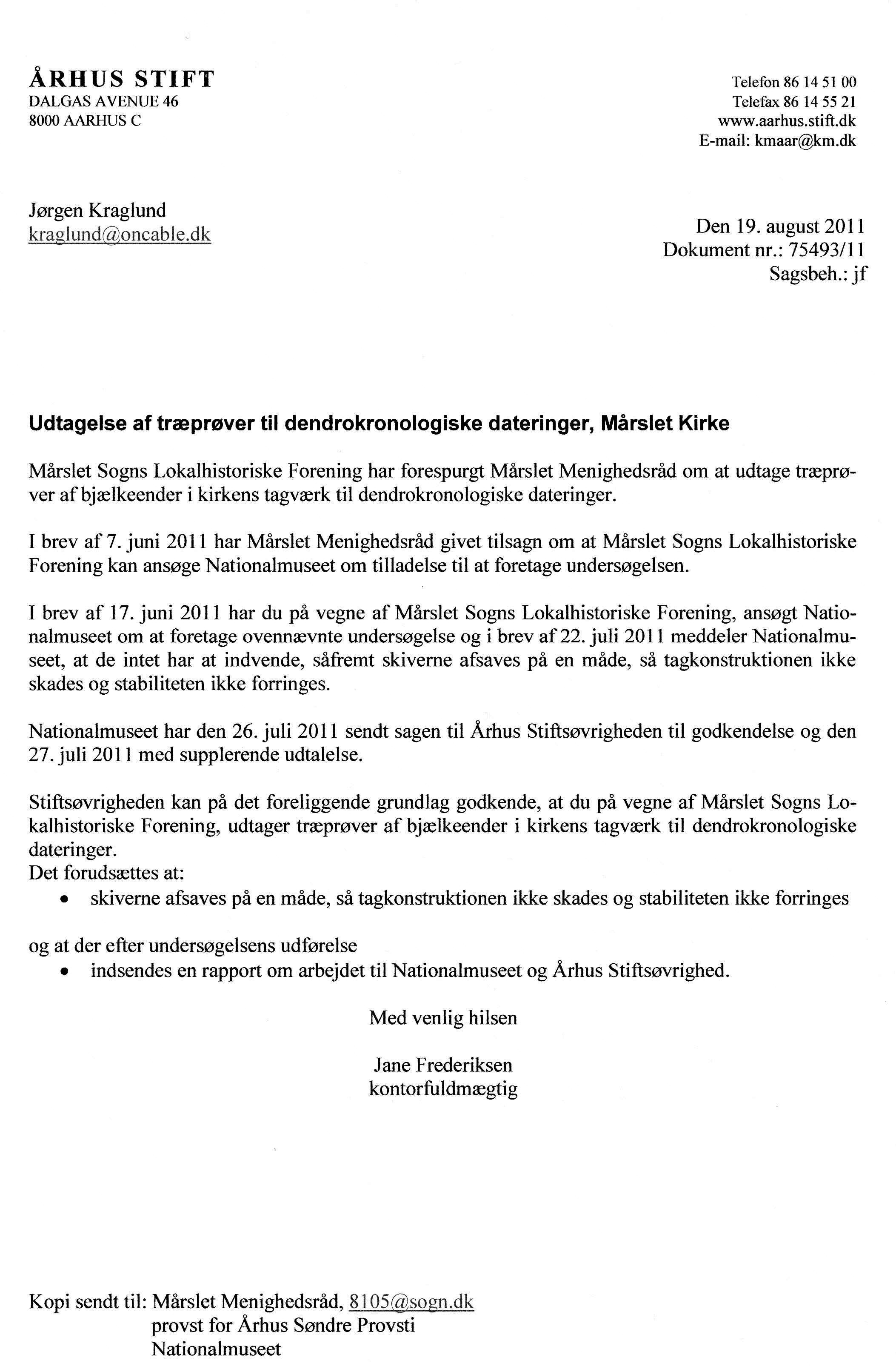 | Tilladelse fra Århus Stift. E-mail fra Jørgen Kraglund 19. august 2011. Kære alle Som det fremgår af vedhæftede fil, har alle kulturhistorisk interesseret her i Mårslet fået en festuge-hilsen fra Århus Stift. De allerbedste hilsner Jørgen K.