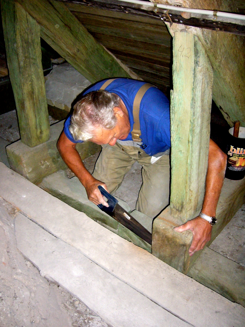 | Afsavning af bjælkeskiver til årringsdatering. Mandag den 29. august var Arne Andersen og Jørgen Kraglund oppe på Mårslet Kirkes loft for at få taget prøver af fire fritsiddende stolper. Christian Adamsen, Skalk, som også står for årringsdaterings-laboratoriet var ligeledes til stede. Han var en stor støtte ved udvælgelsen af egnede stolper til datering. Arne foretog afsavningen med sikker hånd og med en specielt til jobbet indkøbt fukssvans. |