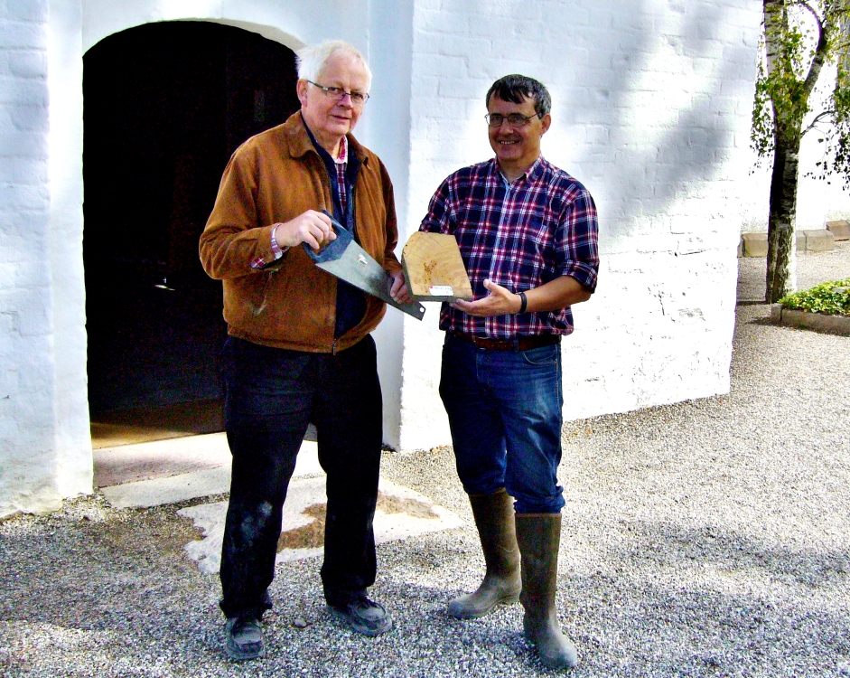 Billede 4. Christian Adamsen med ét af de afskårne bjælkeskiver og Jørgen Kraglund der står med den til formålet nyindkøbte fintandede fukssvans.