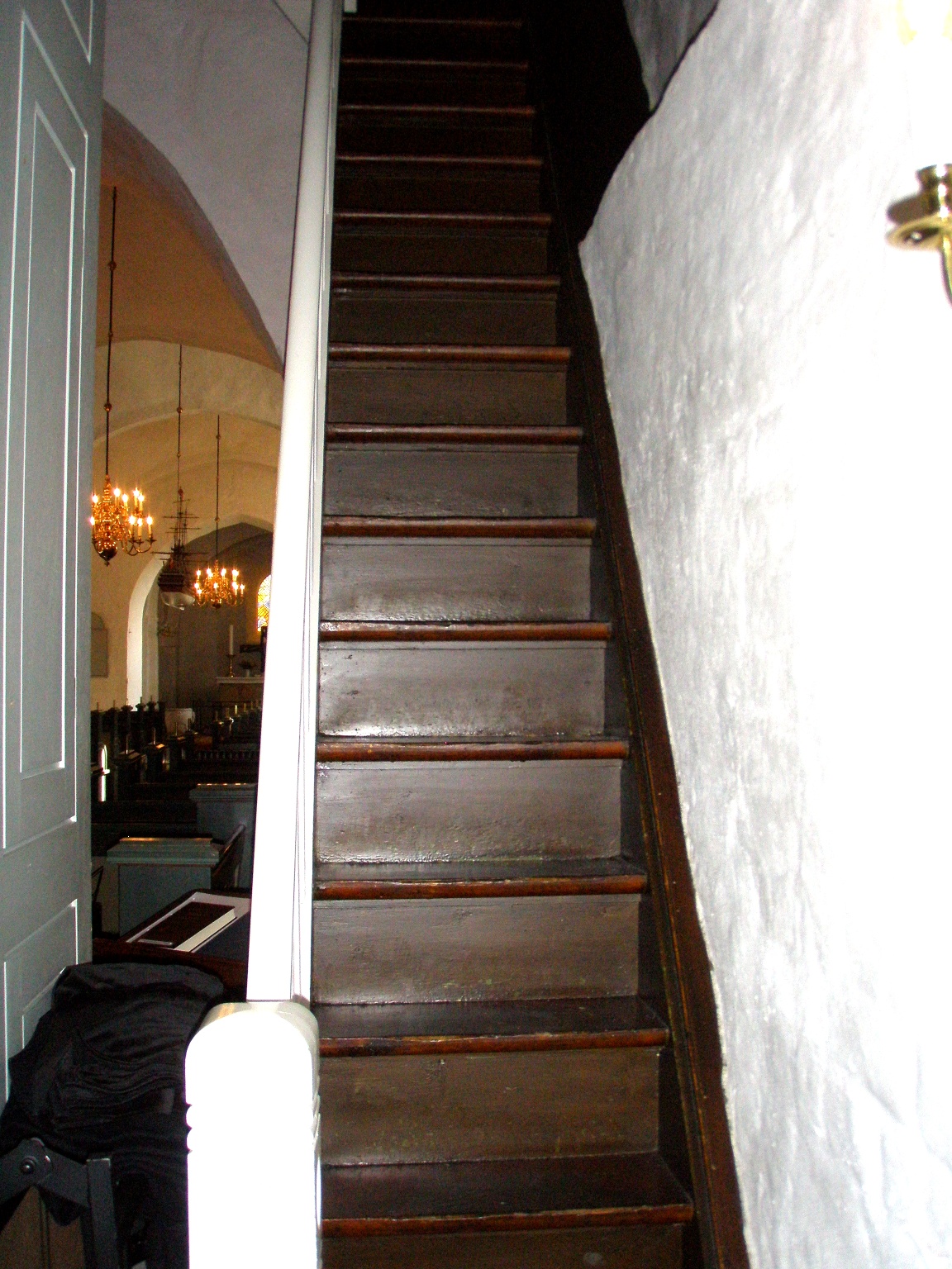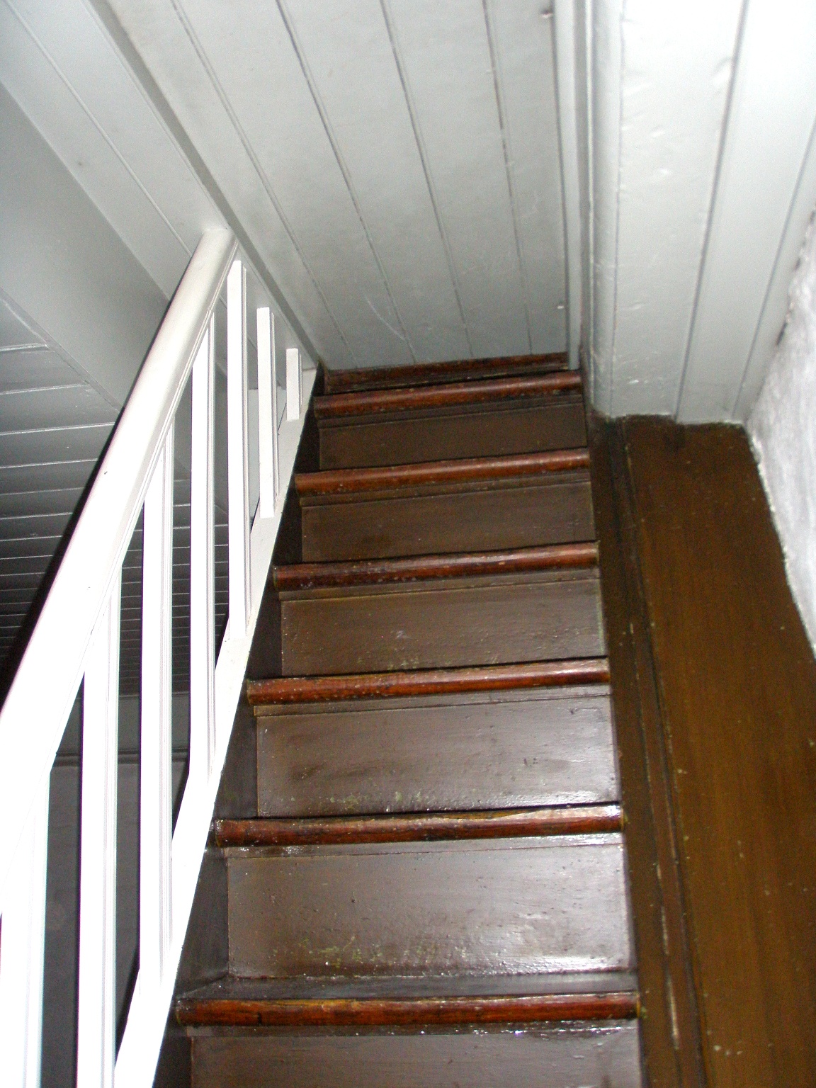 Billede 11 + 12. Op ad den stejle trappe til reposen. Billede 13 + 14. Så det sidste stykke til lemmen til loftet. ____