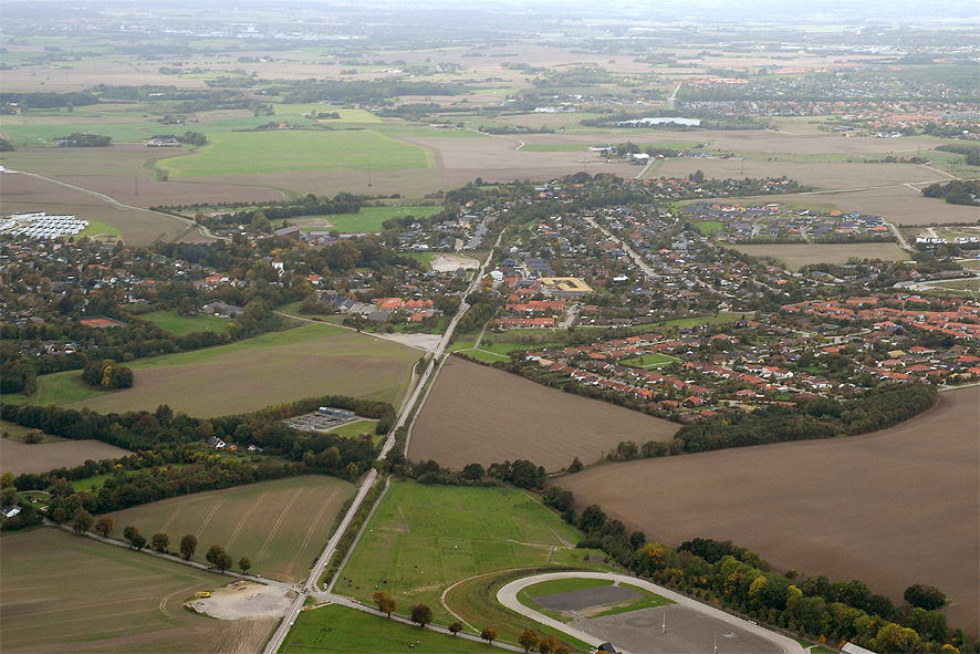 Den nyrenoverede Odderbane med Mårslet station i midten af billedet.
