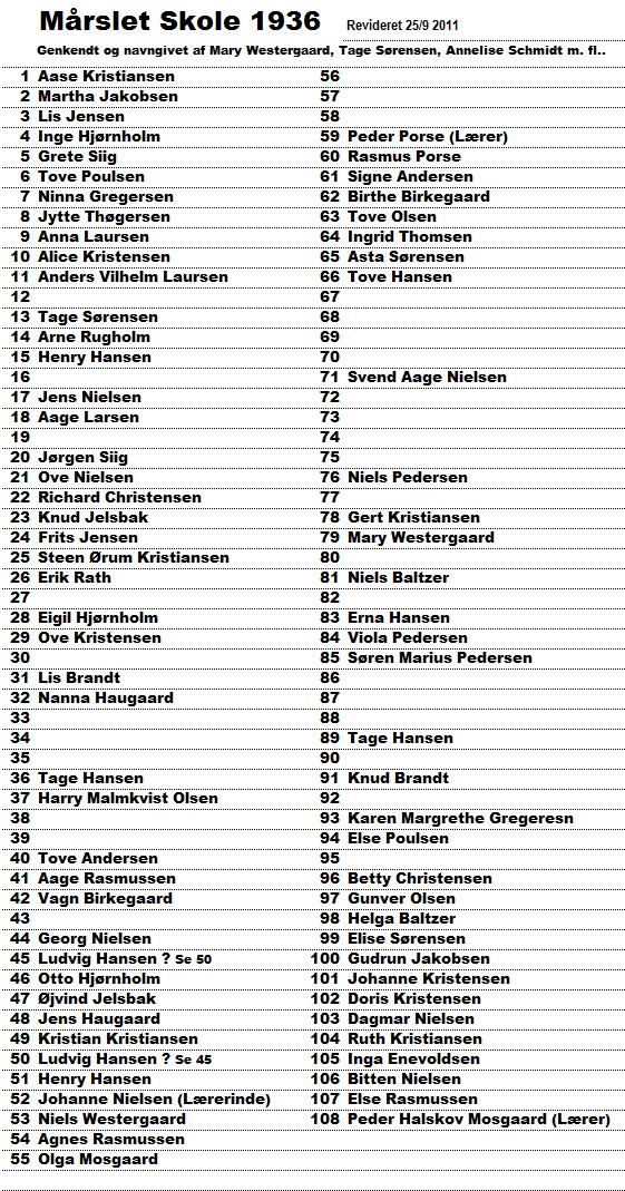 | Lærerne er Porse, Mosgaard og Johanne Nielsen Se nummer- og navneliste under billedet. Elever genkendt og navne sat på billedet af Mary Westergaard, Tage Sørensen og Annelise Schmidt. Kender du elever på billedet der ikke er genkendt og navngivet send en e-mail til: maarsletegnsarkiv@gmail.com Eventuelle rettelser modtages også gerne. Se billedet større - tryk på billedet. Billede på Mårslet Egnsarkiv. Registreret i Arkibas Billed ID: B2017. | |