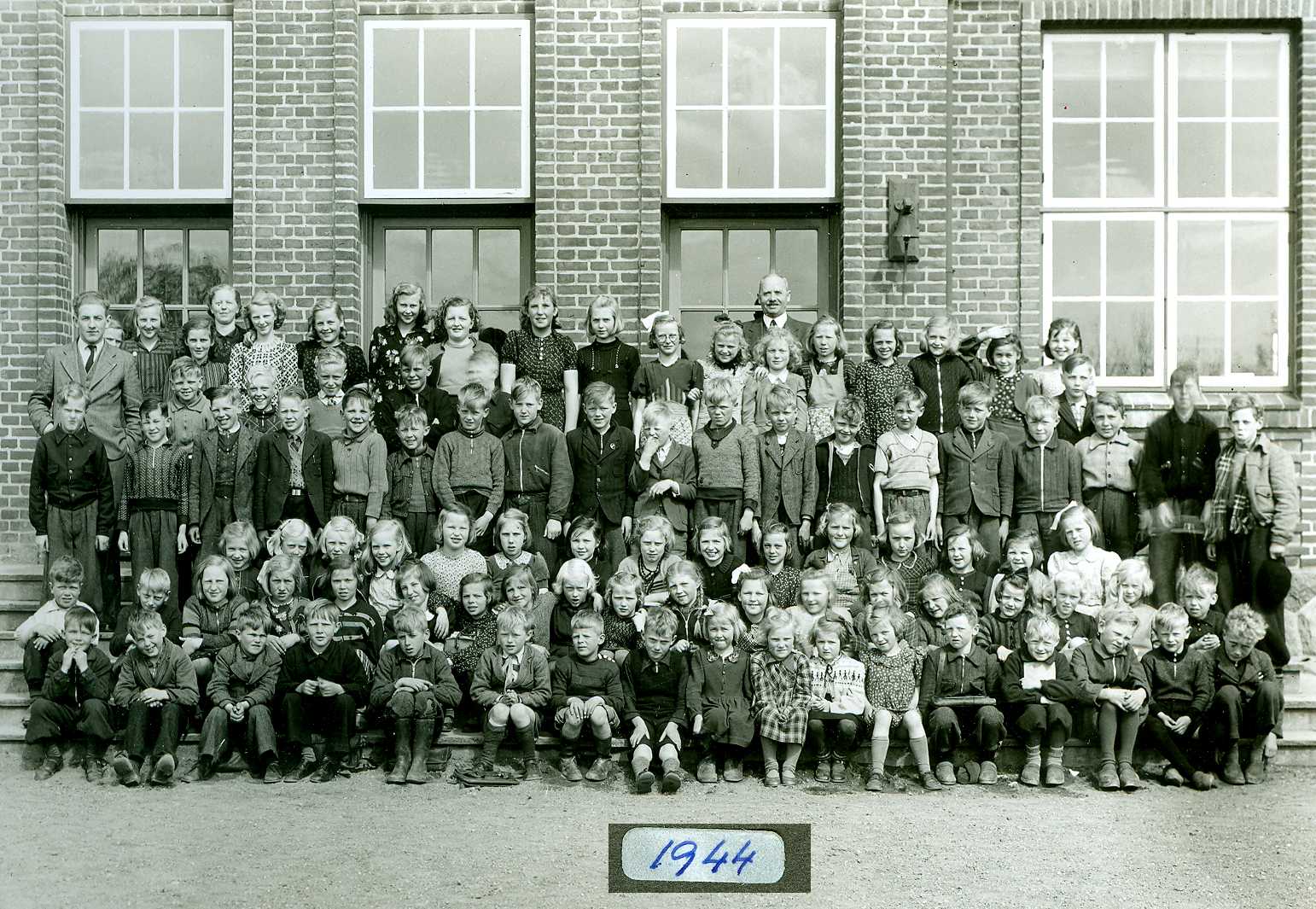 | Bagerste række fra v. Lærer Zoffmann Jensen Skjult pige bag hans skulder nr. 2: Kaja Mortensen nr. 5: Aase Kristiansen nr. 7: Lillian Steffensen nr. 8: Lis (Annelise) Thøgersen Genkendt af Peder Kristiansen: 1. række fra venstre: nr. 7: Peder Kristiansen 4. række fra venstre nr. 1: Jørgen With nr. 3: Svend Kristiansen nr. 7: Jørn Kristiansen (Centralen) nr. 8: Knud Olesen (Visbjerg) nr.10: Kristian Andersen (Ovesdal) 5. række fra venstre: nr 5: (læreren tælles med) Erik Kristiansen Allerbagerst: førstelærer P.H.Mosgaard. Genkendt af Inger Poulsen m. fl. (27/6 2012): 3. række fra venstre: nr. 12: Marie Poulsen O. Mårslet | |