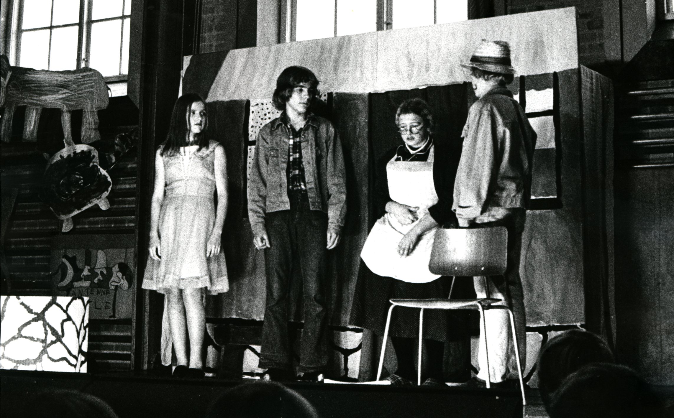 Mårslet Skole. Skolefest 1972. 7 kl. optræder med stykket 'Ekkoet i dalen'.